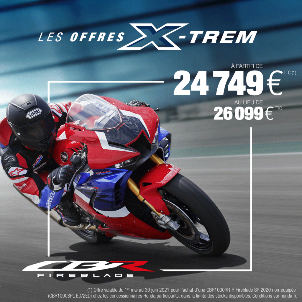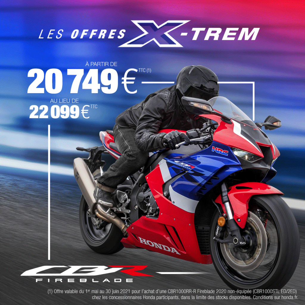 Dans le cas où votre achat ne requiert aucune reprise, vous pourrez bénéficier d’une remise équivalente, soit 1 200 € pour une CBR1000RR-RR Fireblade 2020, sur l’achat d’accessoires ou d’équipements moto chez votre concessionnaire Honda.